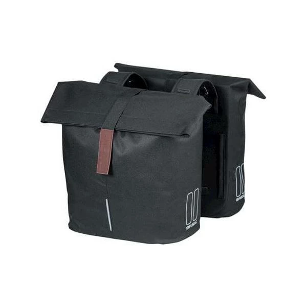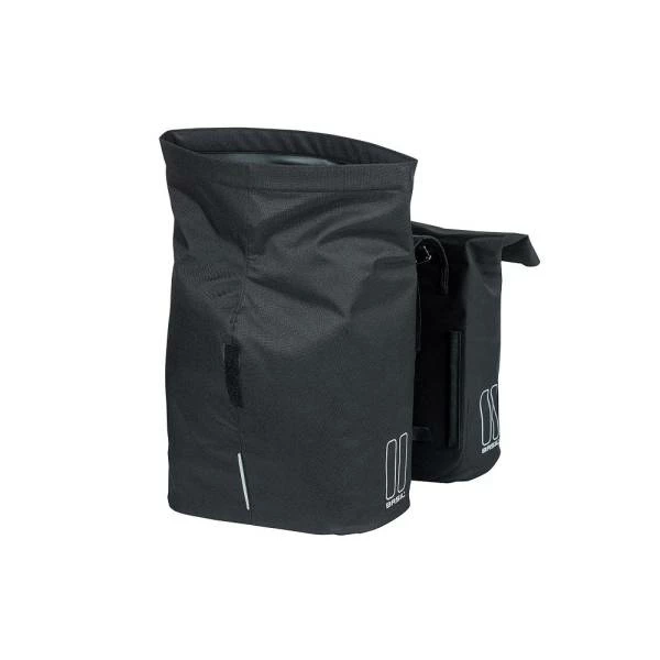 Deze zwarte dubbele fietstas van Basil is zeer praktisch, en nog modieus en elegant ook.