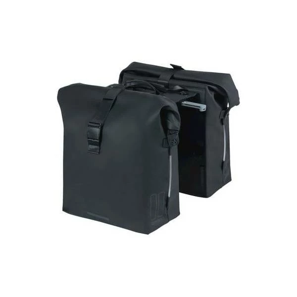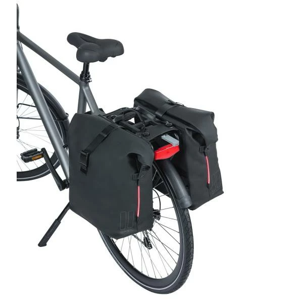 De dubbele fietstas SoHo Nordlicht van Basil heeft een ruime inhoud van 41 liter en is gemaakt van waterafstotend polyester.