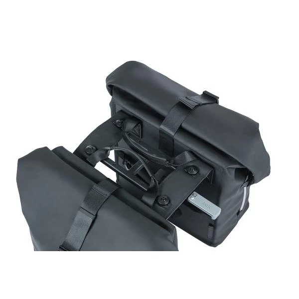 Deze praktische dubbele fietstas is gemaakt van polyester en is waterdicht dankzij de rolsluiting en de getapete naden.