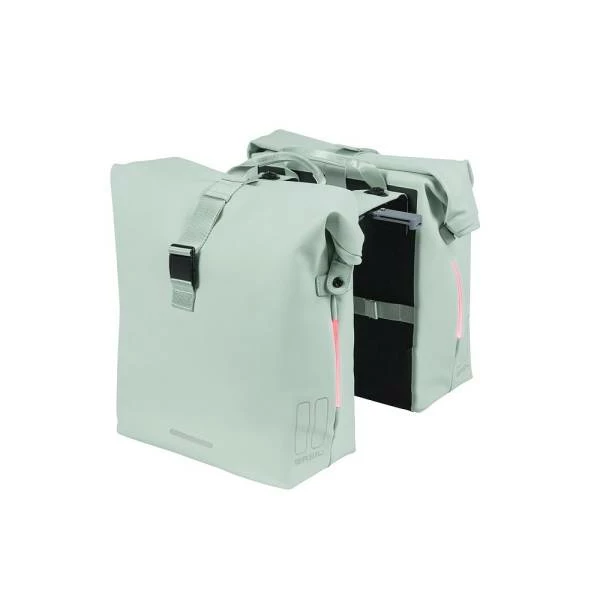 De dubbele fietstas SoHo Nordlicht van Basil heeft een ruime inhoud van 41 liter en is gemaakt van waterafstotend polyester.