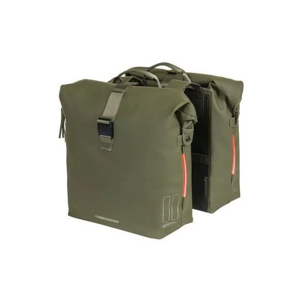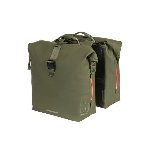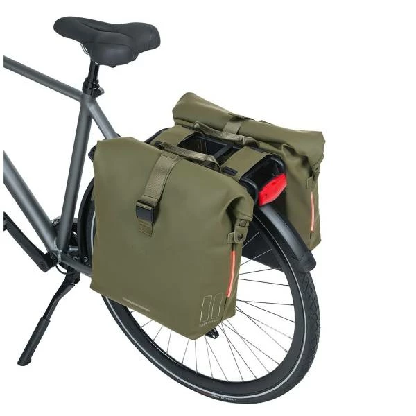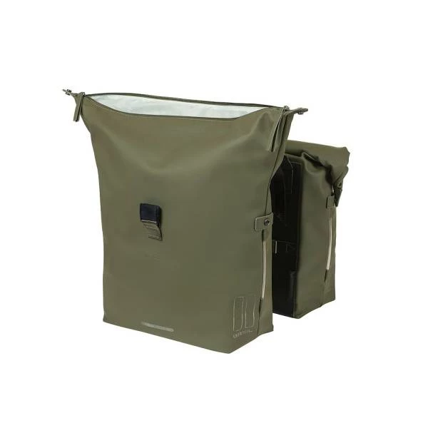 De dubbele fietstas SoHo Nordlicht van Basil heeft een ruime inhoud van 41 liter en is gemaakt van waterafstotend polyester.