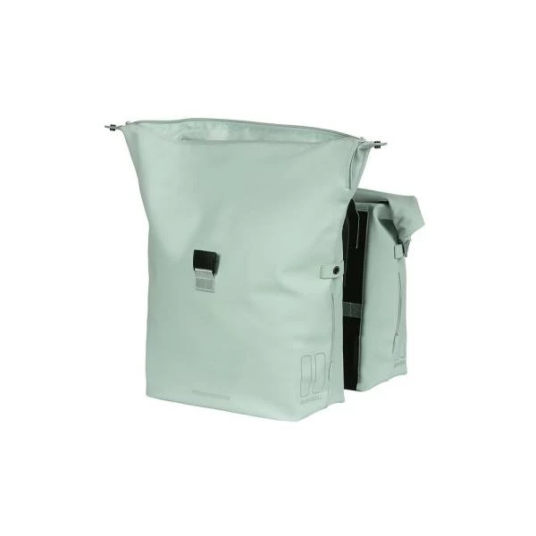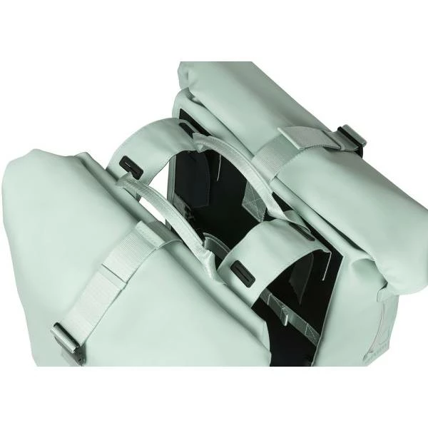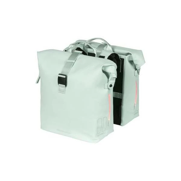 De dubbele fietstas SoHo Nordlicht van Basil heeft een ruime inhoud van 41 liter en is gemaakt van waterafstotend polyester.