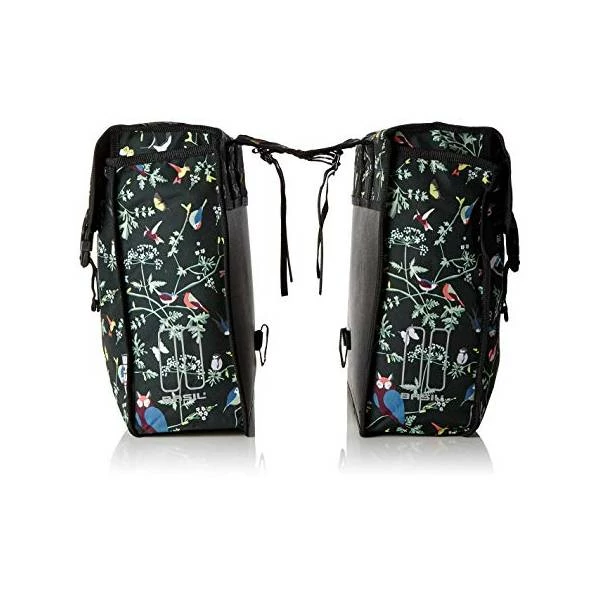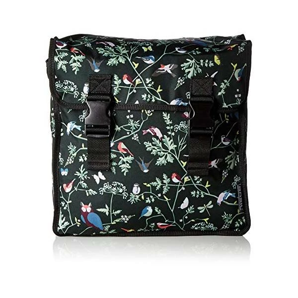 De Basil Wanderlust ist een dubbele fietstas met vrolijke vogelprint voorzien van waterafstotend materiaal, kliksluitingen en reflectiedetails.