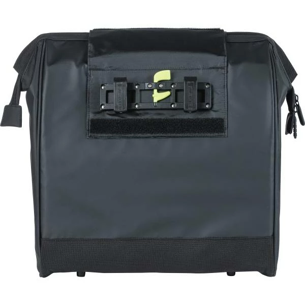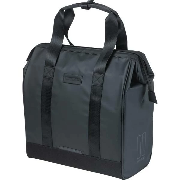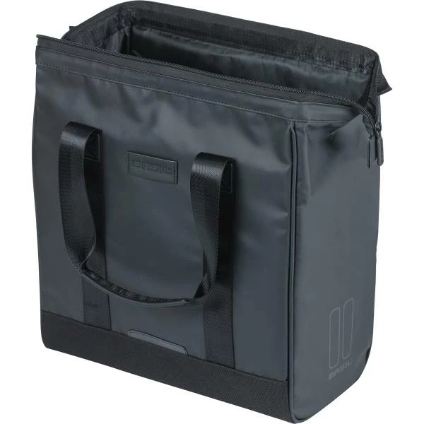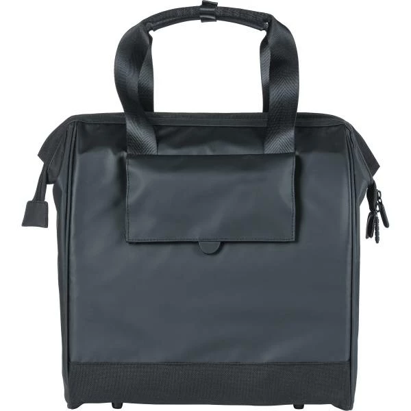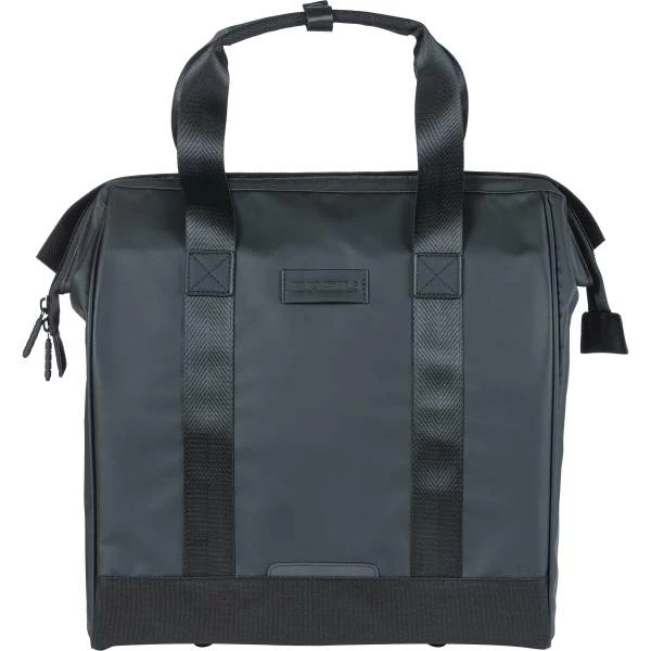 Basil Grand Tarpaulin fietsshopper, waterafstotend 600D polyester, groot hoofdvak met gepolsterd (laptop)vak, stabiele tas, met voetjes, zgn dokterssluiting, met regenwerende afwerking.