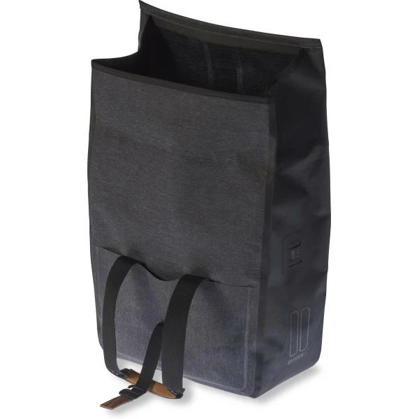 BASIL URBAN DRY SHOPPER, fietsshopper, waterdicht (IPX 3), polyester, gelaste naden, vouwsluiting, bev.mogelijkheid LED, vegan leather details, voorvak, binnenvak met rits, handgrepen, verstelbare sluiting, Hook On-system, reflectie op drie zijden, inh. 25L, charcoal melee