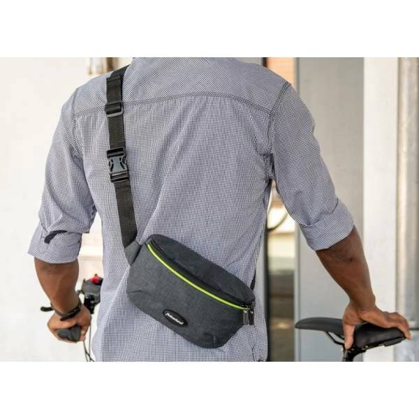 Als de houderhoes op het lichaam nog comfortabel te dragen is, wordt het dankzij de klittenbandsluiting een veilige houder voor de schouderriem op het fietsstuur.