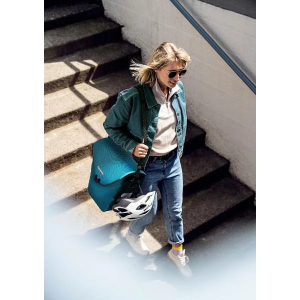 Aan de andere kant van de fiets kan je hem met de afneembare draagriem gewoon over de schouder hangen.